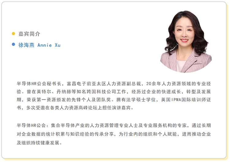 918博天堂官网国际“行业瞭望”系列第八期邀请半导体HR公会秘书长,富昌电子前亚太区人力资源副总裁徐海燕女士,分享其关于集成电路行业人才招聘管理、培育、