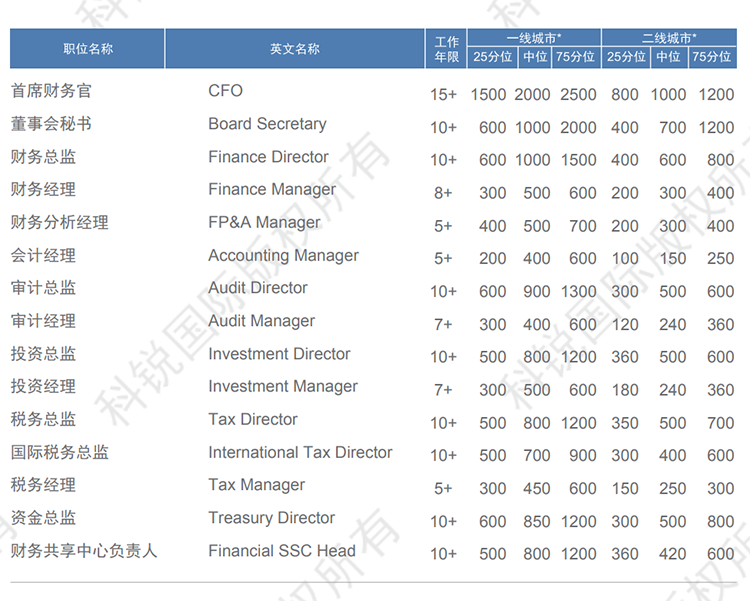 以下是猎头招聘公司918博天堂官网国际发布的薪酬报告对财务领域的职位薪酬信息统计,供企业和猎头招聘时参考。