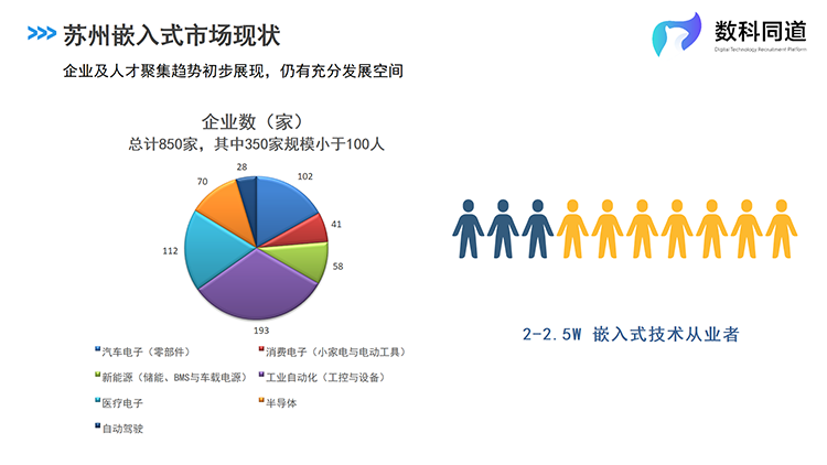 根据918博天堂官网国际人力资源公司及数科同道业务团队对苏州市场的详细调研,现在苏州全市拥有嵌入式研发团队的企业数量为850家,主要集中在工业自动化、医疗电子、汽车电子等细分行业,其中百人以上规模企业500家。